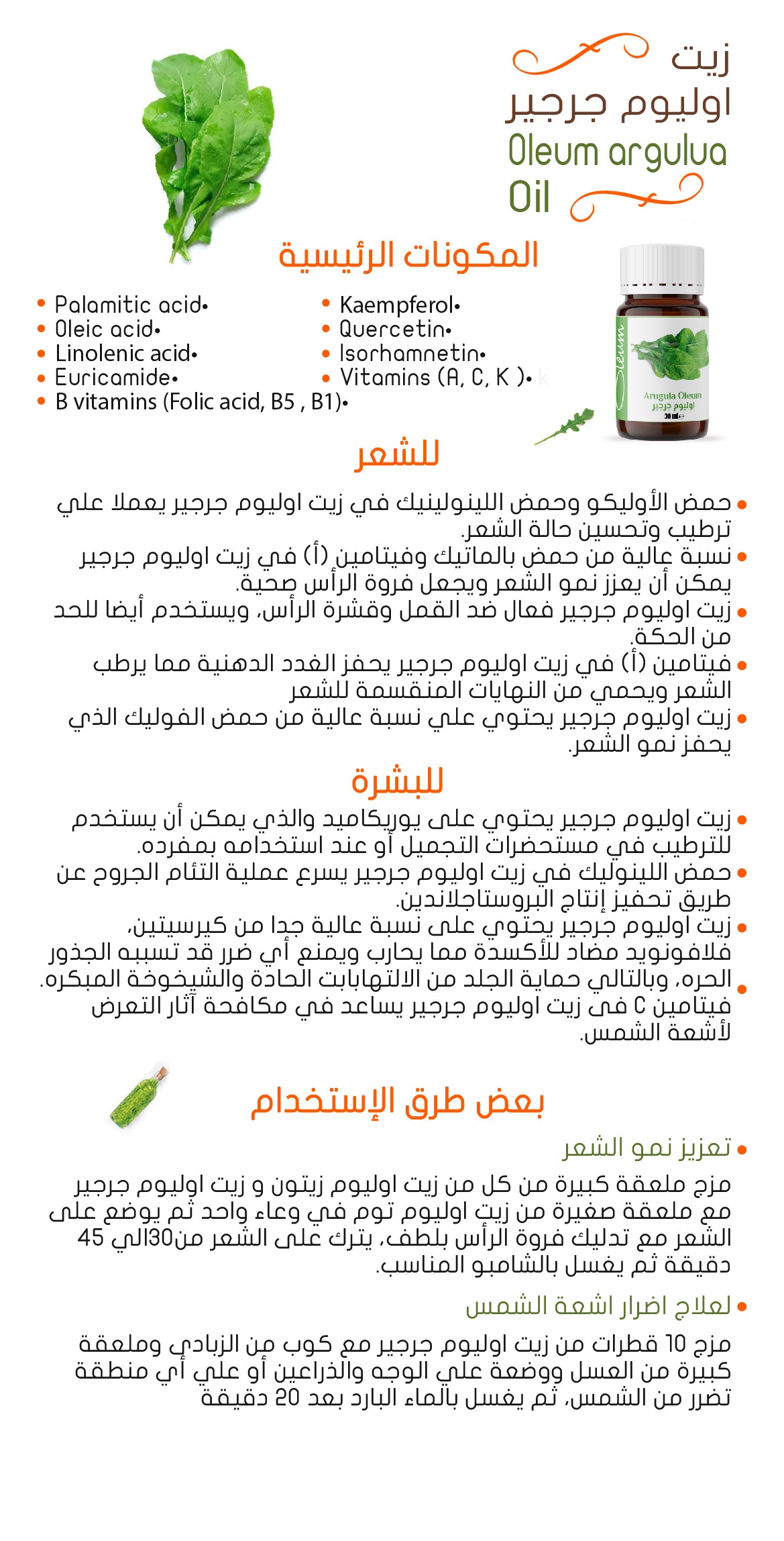 زيت الجرجير من أوليوم مثالي للاستخدام الخارجي فقط، وليس للاستهلاك البشري. وهو مثالي لتعزيز نمو الشعر الصحي من خلال تغذية فروة الرأس ودعم صحة الشعر. كما أنه يجدد البشرة ويغذيها ليمنحكِ مظهرًا شابًا، مما يجعله إضافة قيّمة لروتين العناية بالبشرة.